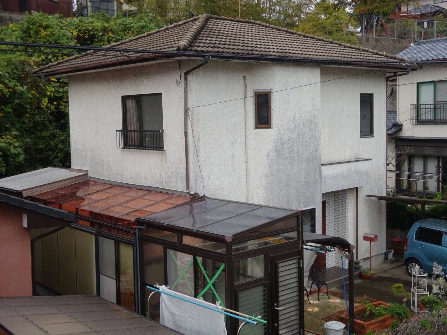 強風にてサンルーム屋根が破損にてのご依頼。サンルーム等、火災保険適用になり、施主様の負担なしにてサンルーム屋根を新しくさせて頂いたのをきっかけに、施主様が手出しをする予定が火災保険適用になり サンルーム修理予算が浮いたので、外壁・屋根塗装はしないといけないと考えてたとの事で、追加で塗装工事をさせて頂きました