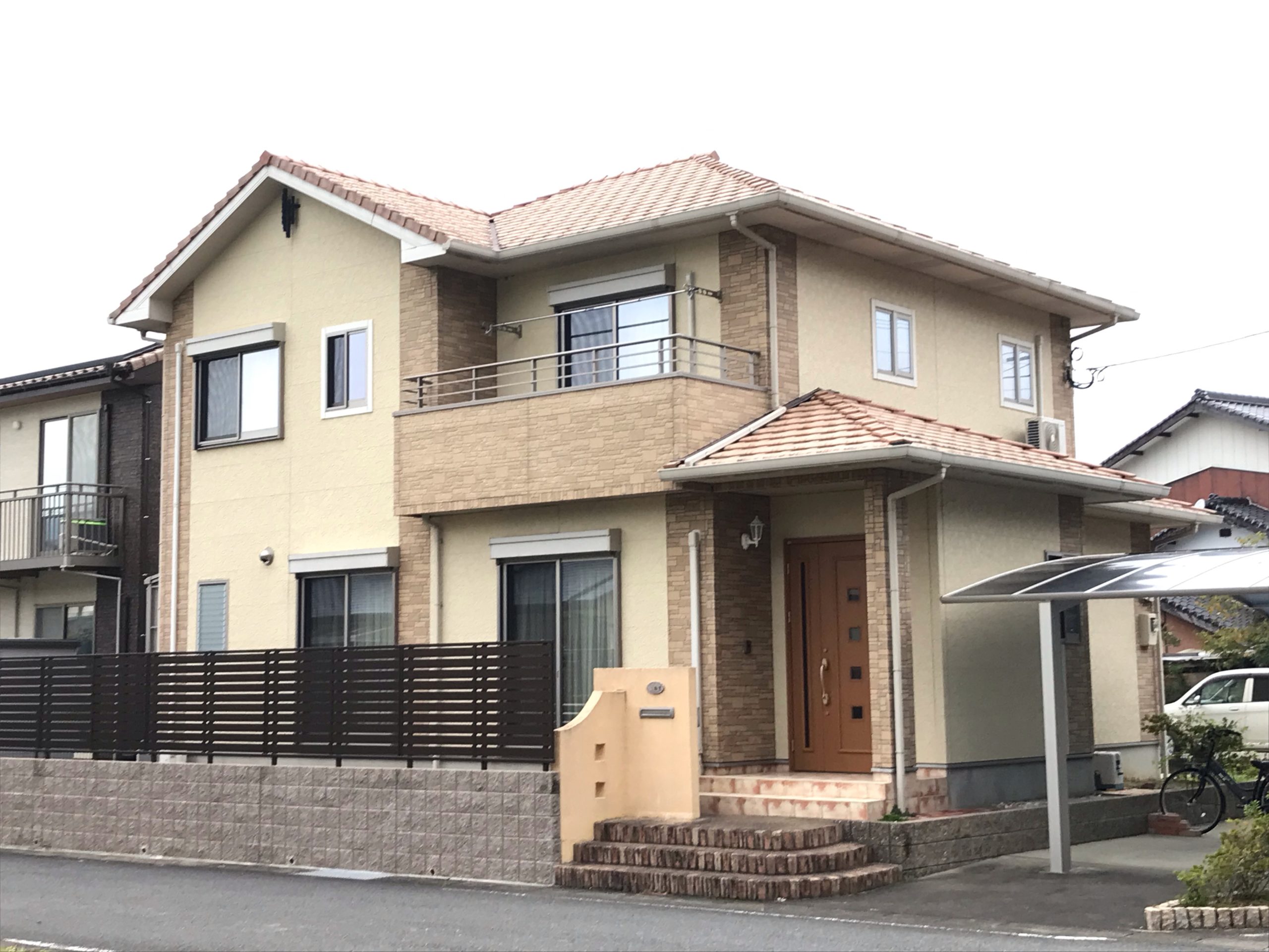外壁アクセントには塗料を2色使い、タイル調を再現しました。 外壁目地コーキングは高耐久な物を使用し、塗膜にひびが入りにくいように、クロラックシーラー(コーキングにひびがはいりにくい) ように一手間増やし、15年~18年の耐久年数で仕上げました。